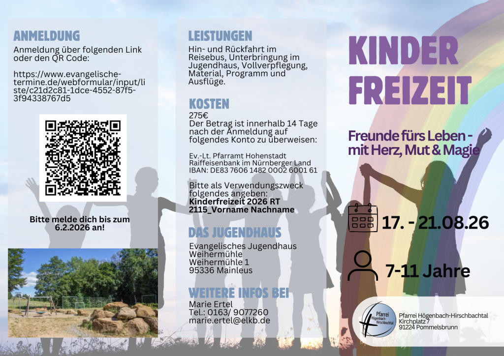 In der Zeit vom 17. bis 21. August laden wir alle Kinder im Alter von 7 bis 11 Jahren herzlich zu unserer Kinderfreizeit ein. Gemeinsam verbringen wir fünf abwechslungsreiche Ferientage, die Raum für Spiel, Bewegung, Kreativität und viele schöne gemeinsame Erlebnisse bieten.
