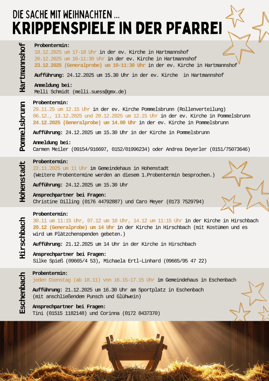 20.12 (Generalprobe) um 14 Uhr in der Kirche in Hirschbach (mit Kostümen und es wird um Plätzchenspenden gebeten.)