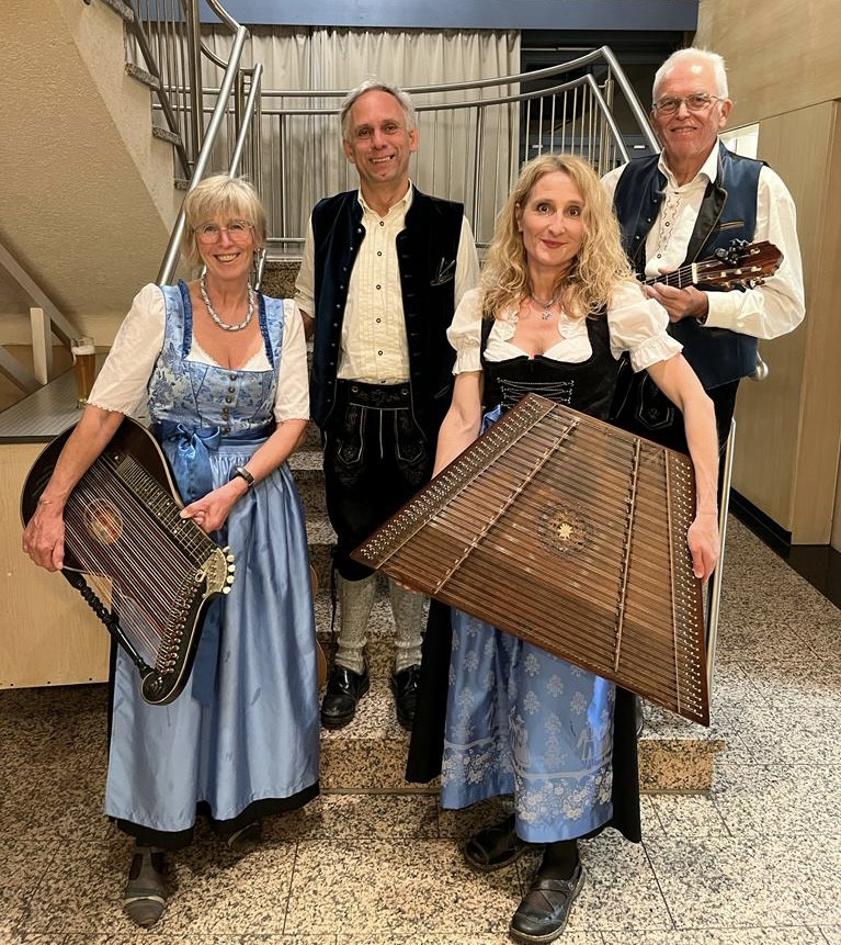 Wir, das ist Heidrun am Hackbrett, oder Akkordeon, Conny an der Zither oder am Akkordeon, Hans an der Gitarre, und Jockel, der die Kontrabasstimme oder auch mal ne Harfenstimme mit der Gitarre übernimmt. Wir spielen hauptsächlich echte fränkische Volksmusik, Weihnachtlieder mit fränkischem Ursprung, aber gerne auch Mal Stücke aus dem Alpenraum, und auch mal schmissigere Stücke, wie den 3. Mann, den Maxglaaner Zigeunermarsch, oder „play a simple melody“. Wir akzeptieren alle Musikstile, Hauptsache, es wird live musiziert, und dabei viel gelacht.